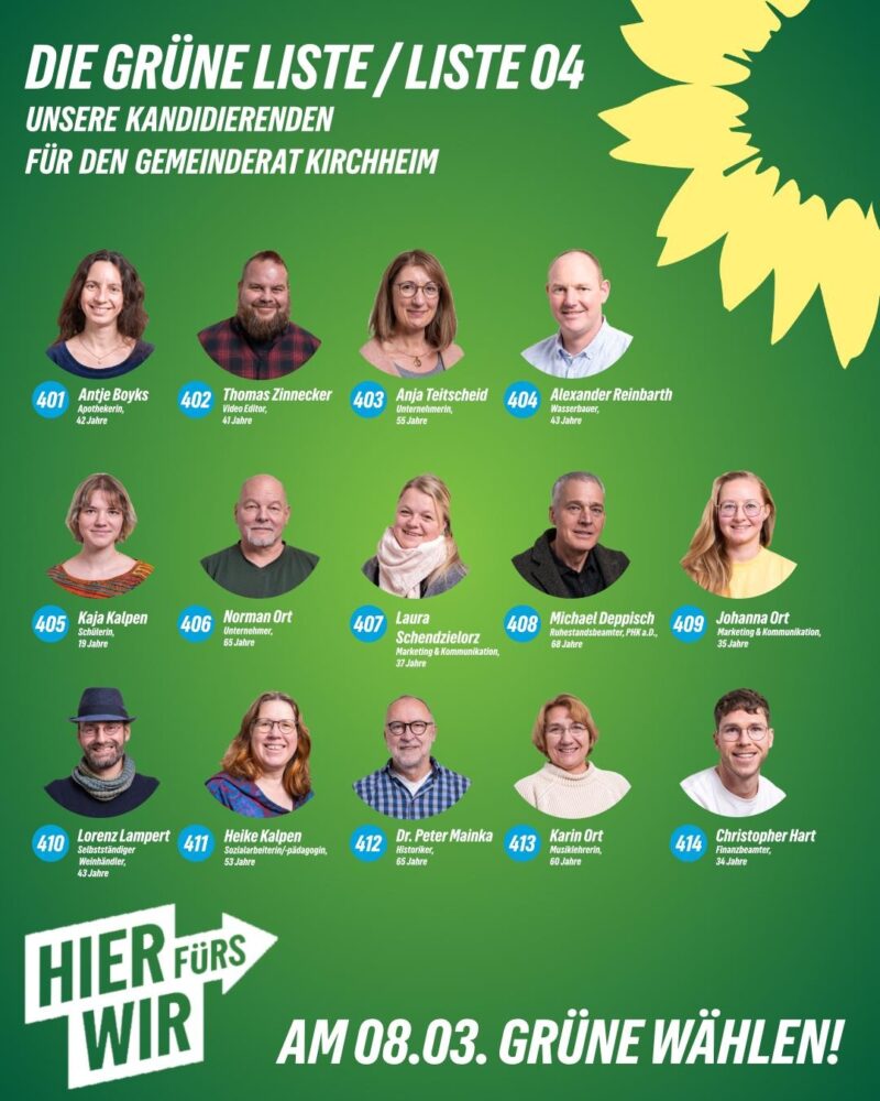 Die jüngste Kandidatin ist 19 Jahre alt, in Kirchheim geboren, der älteste Kandidat 68 Jahre alt. Uns verbindet das gemeinsame Ziel, unsere Gemeinde verantwortungsvoll, nachhaltig und lebenswert weiterzuentwickeln.